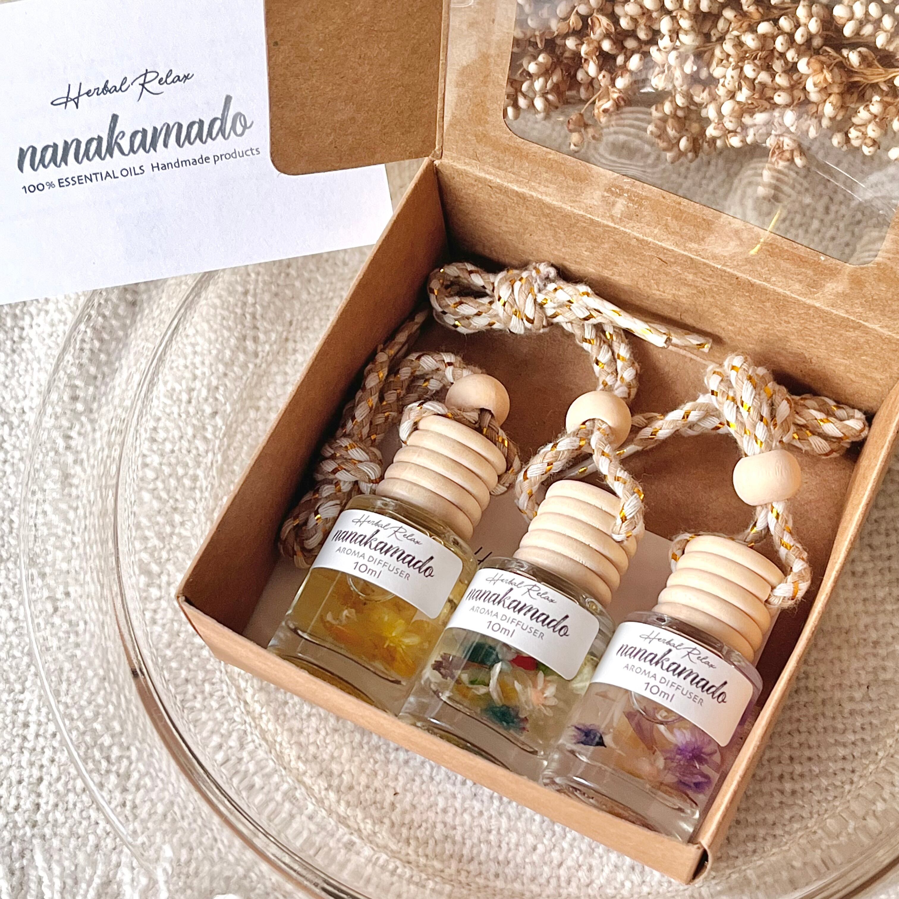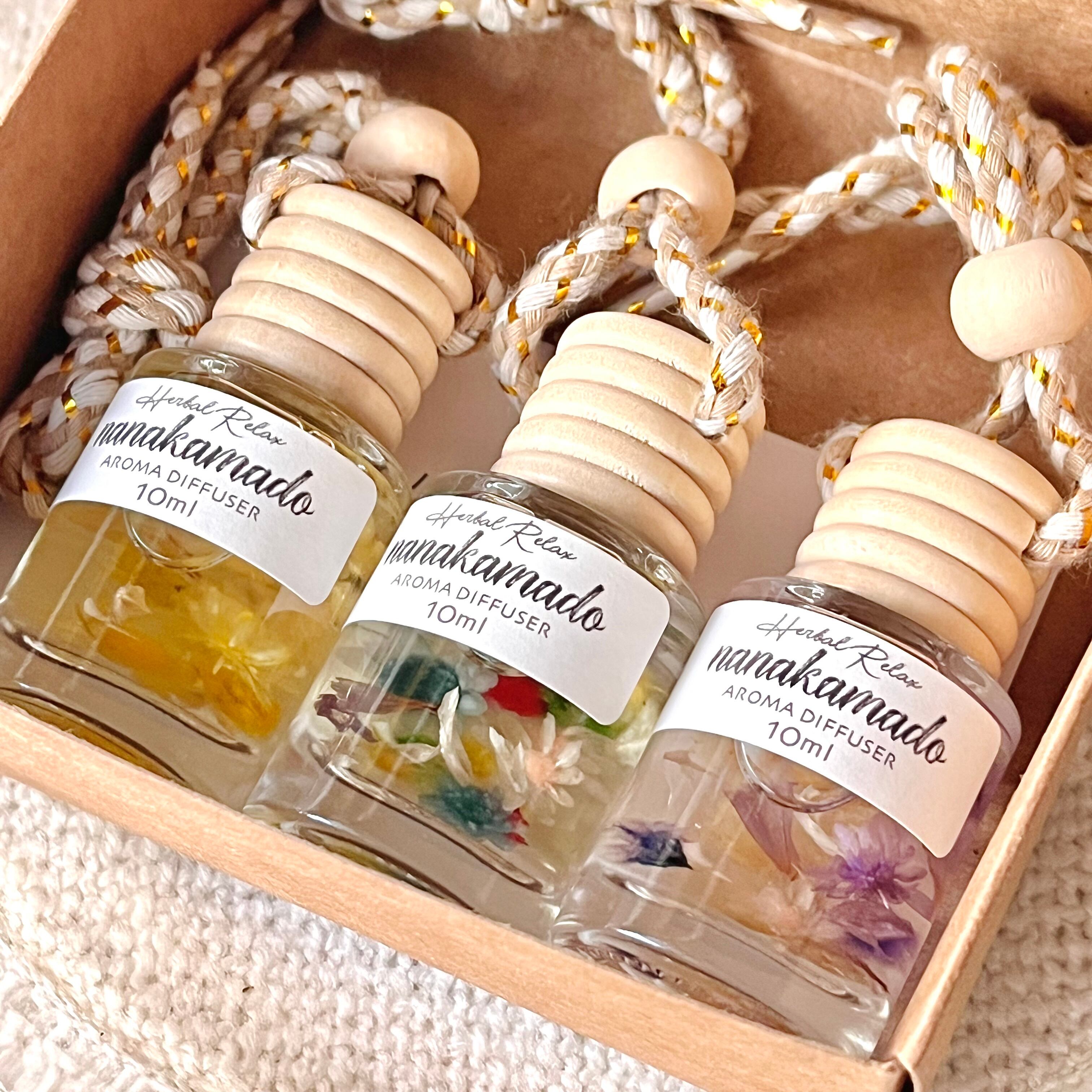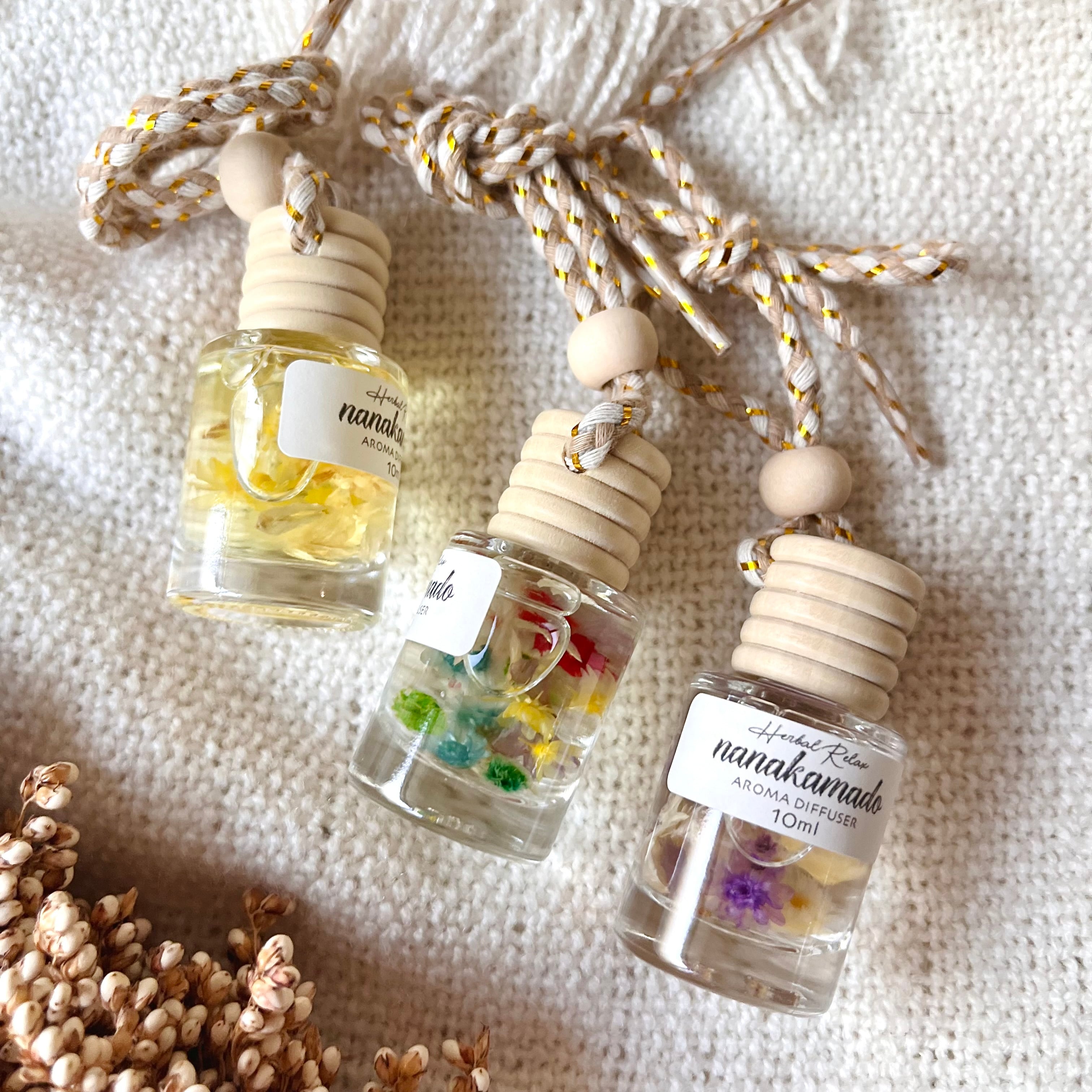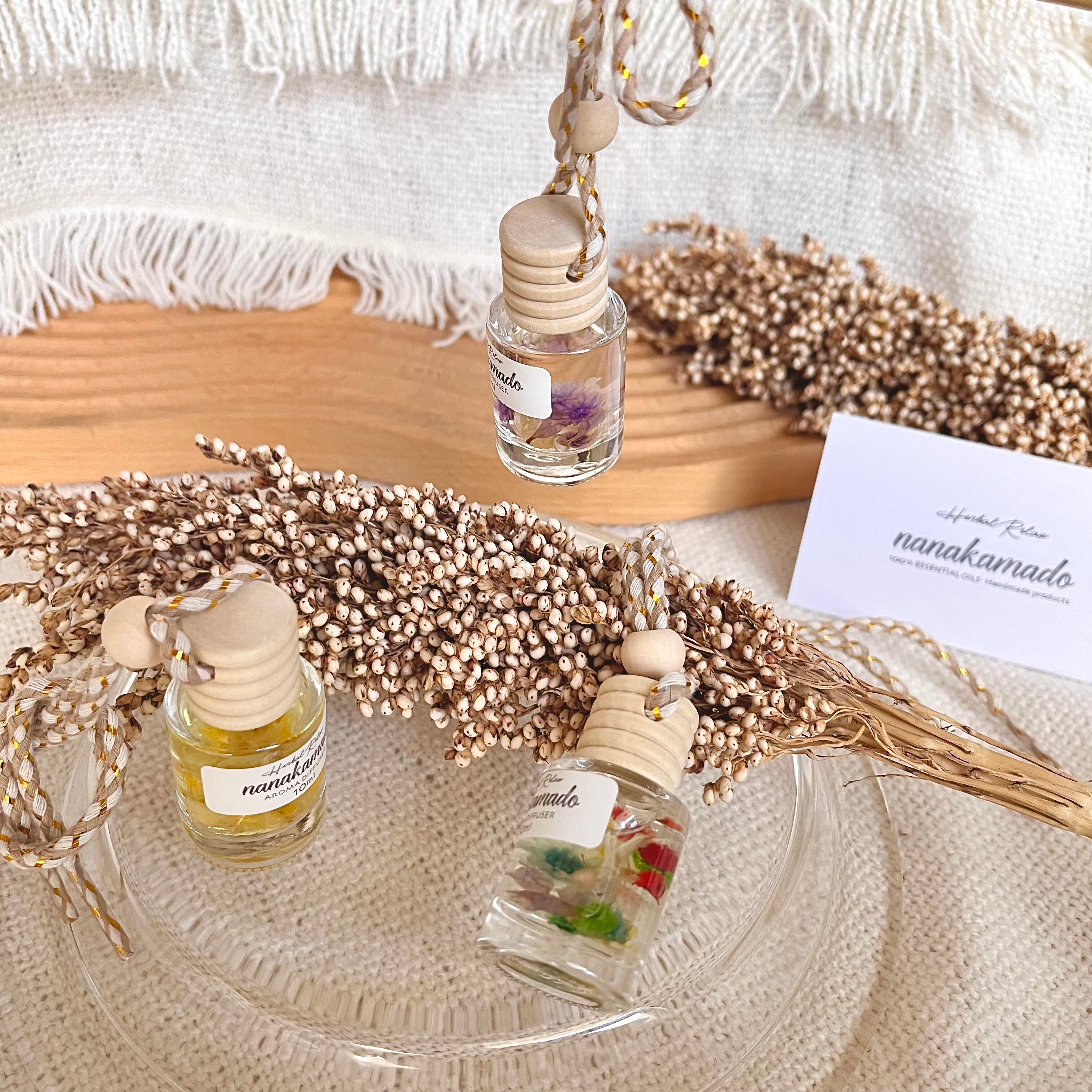 "nanakamadoのアロマデュフューザー"は、無水エタノール、アロマオイル(精油)、本物の花(ドライフラワー)、グリセリンをブレンドしたおしゃれなフレグランスアイテムです。