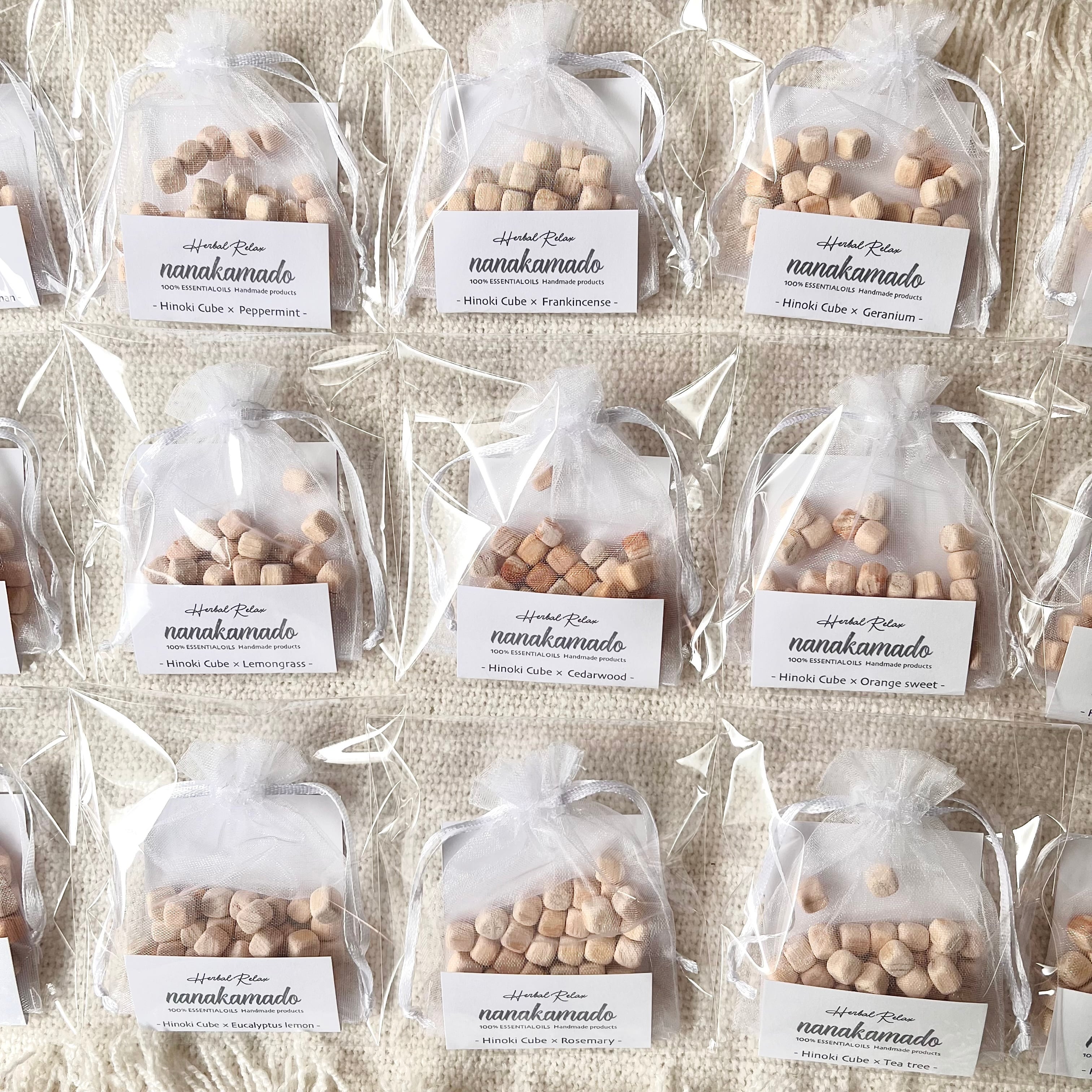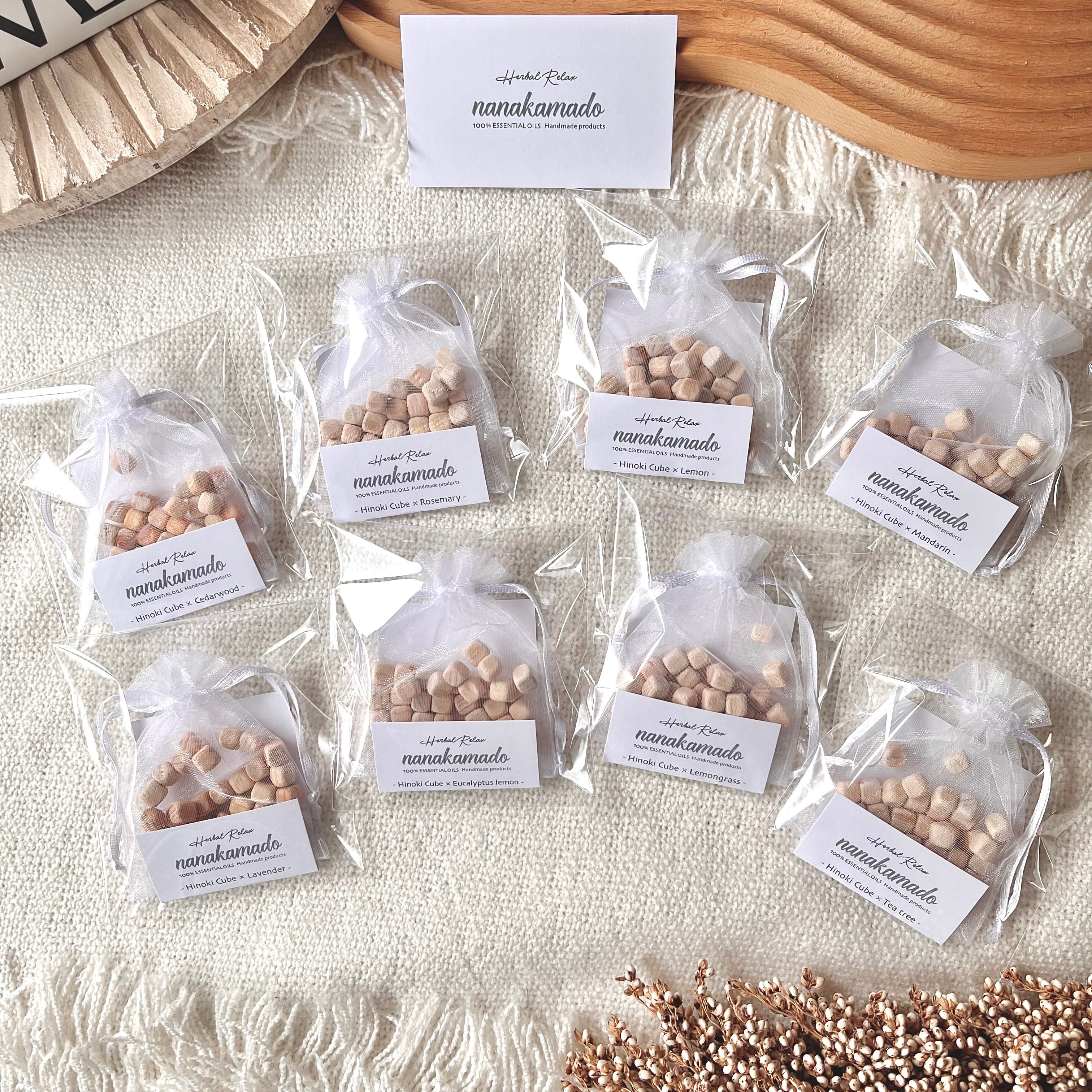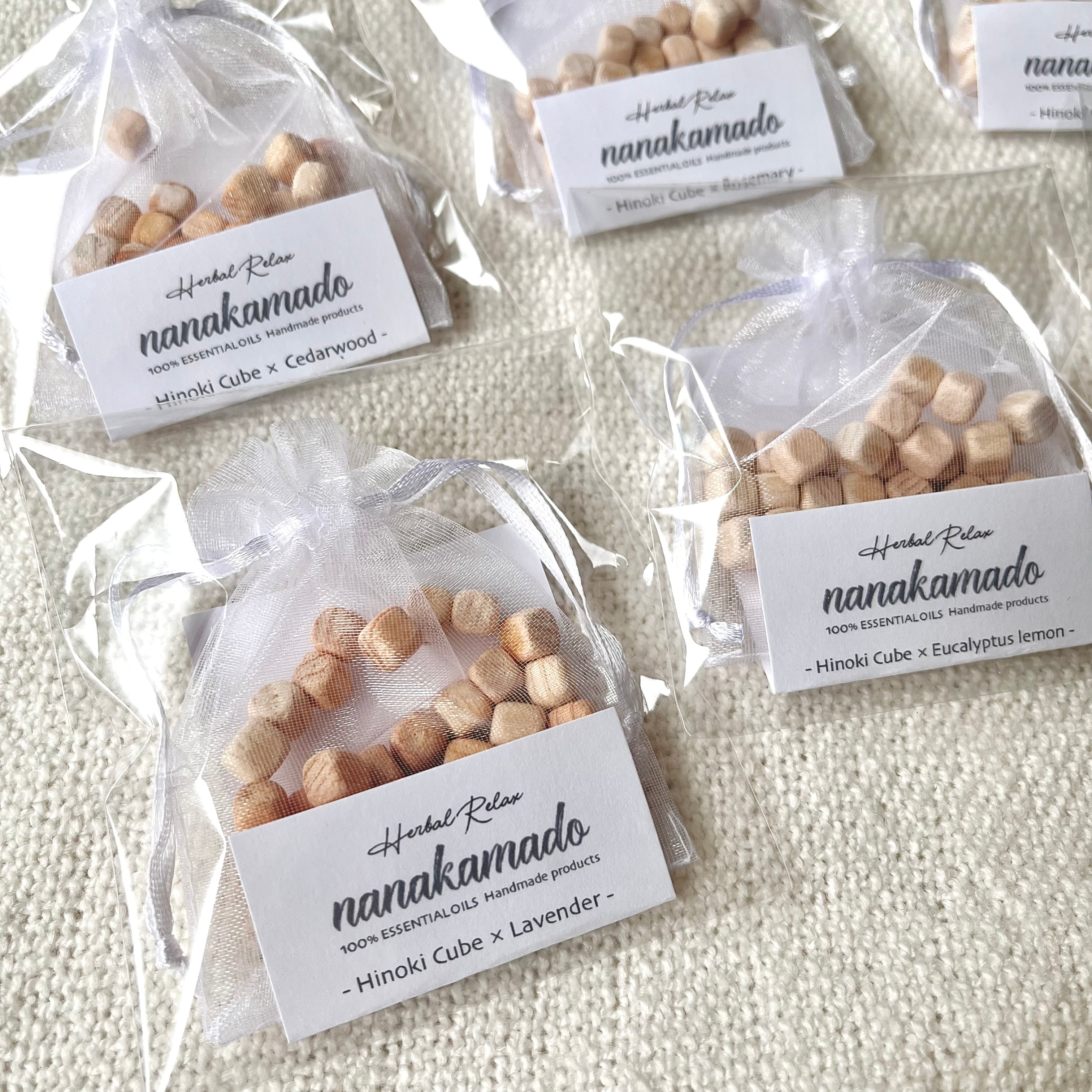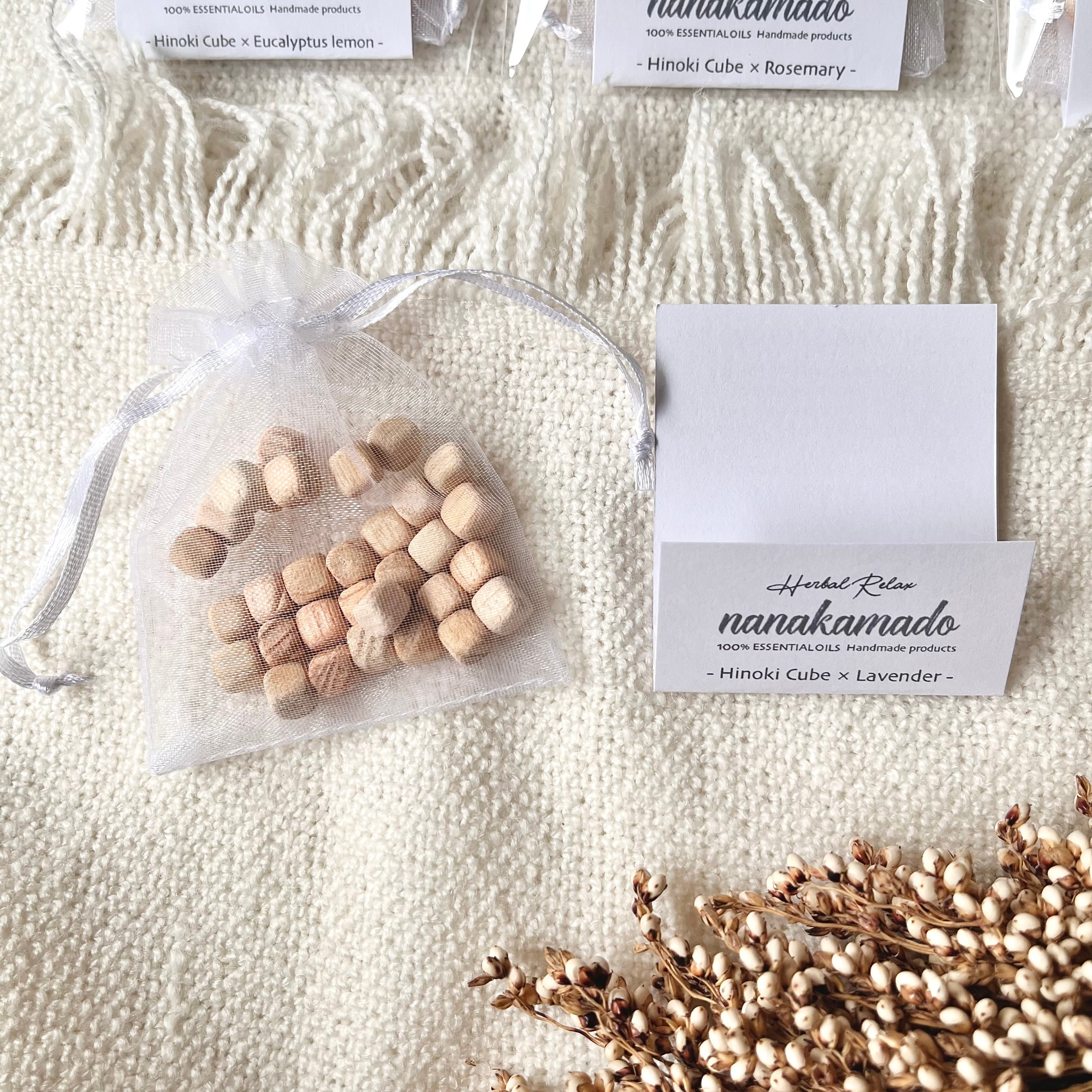 ほんのり”ひのきの香り”がするヒノキキューブに精油を染み込ませたおしゃれでサステナブルなフレグランスアイテム《nanakamadoヒノキアロマサシェ》です。