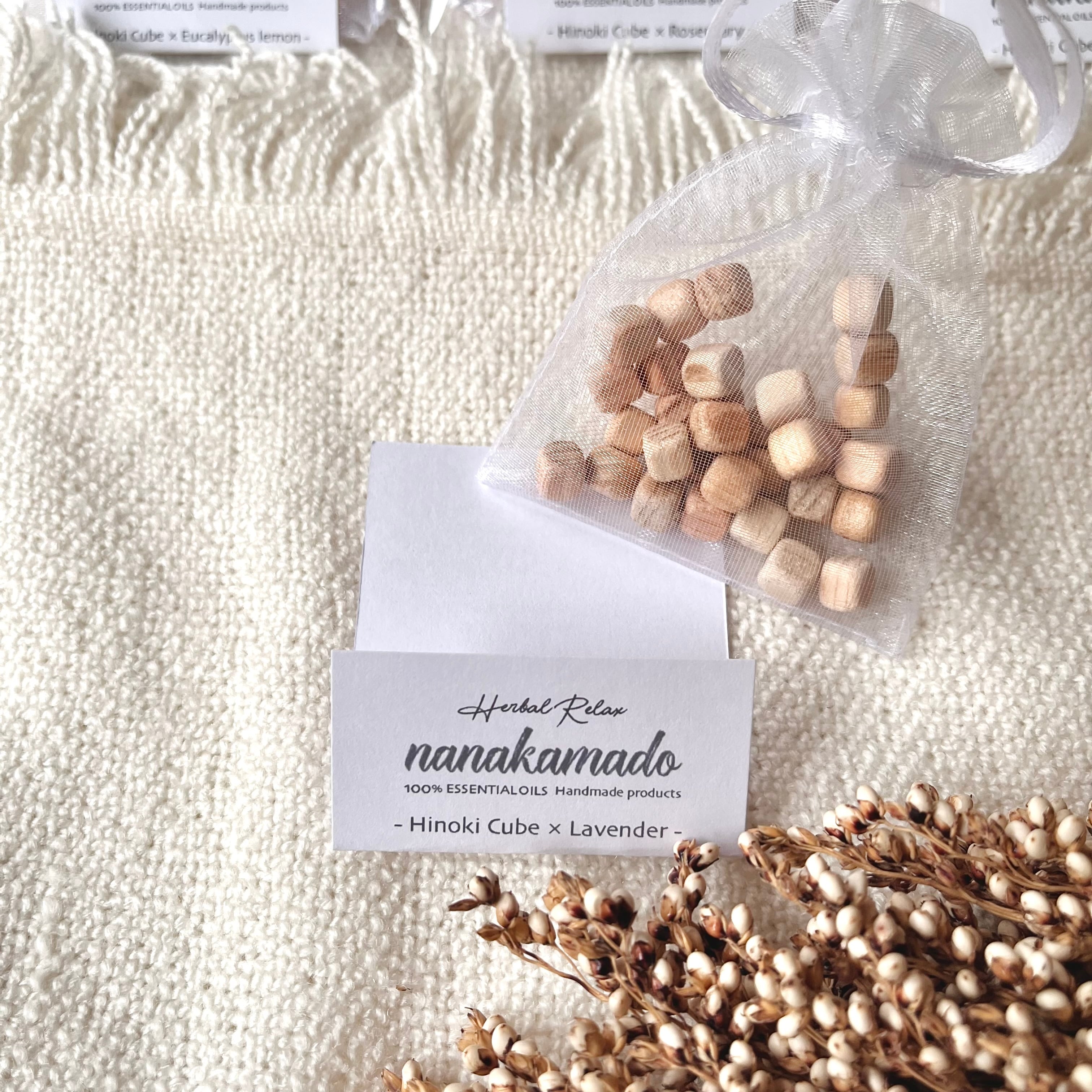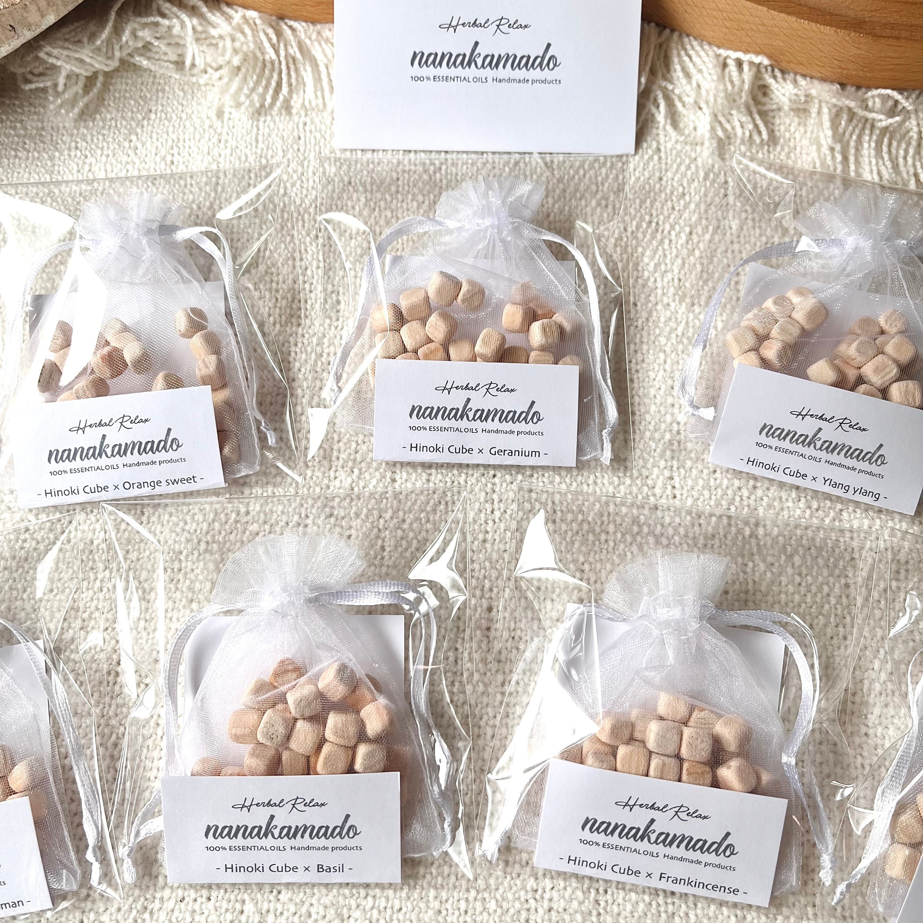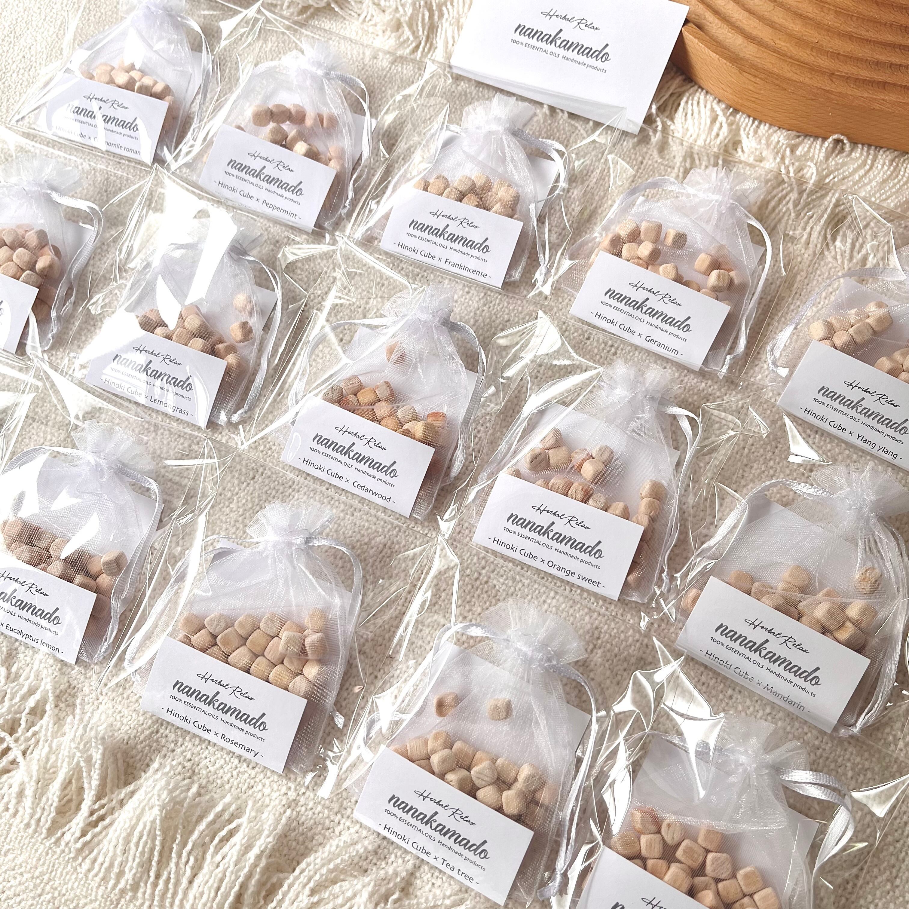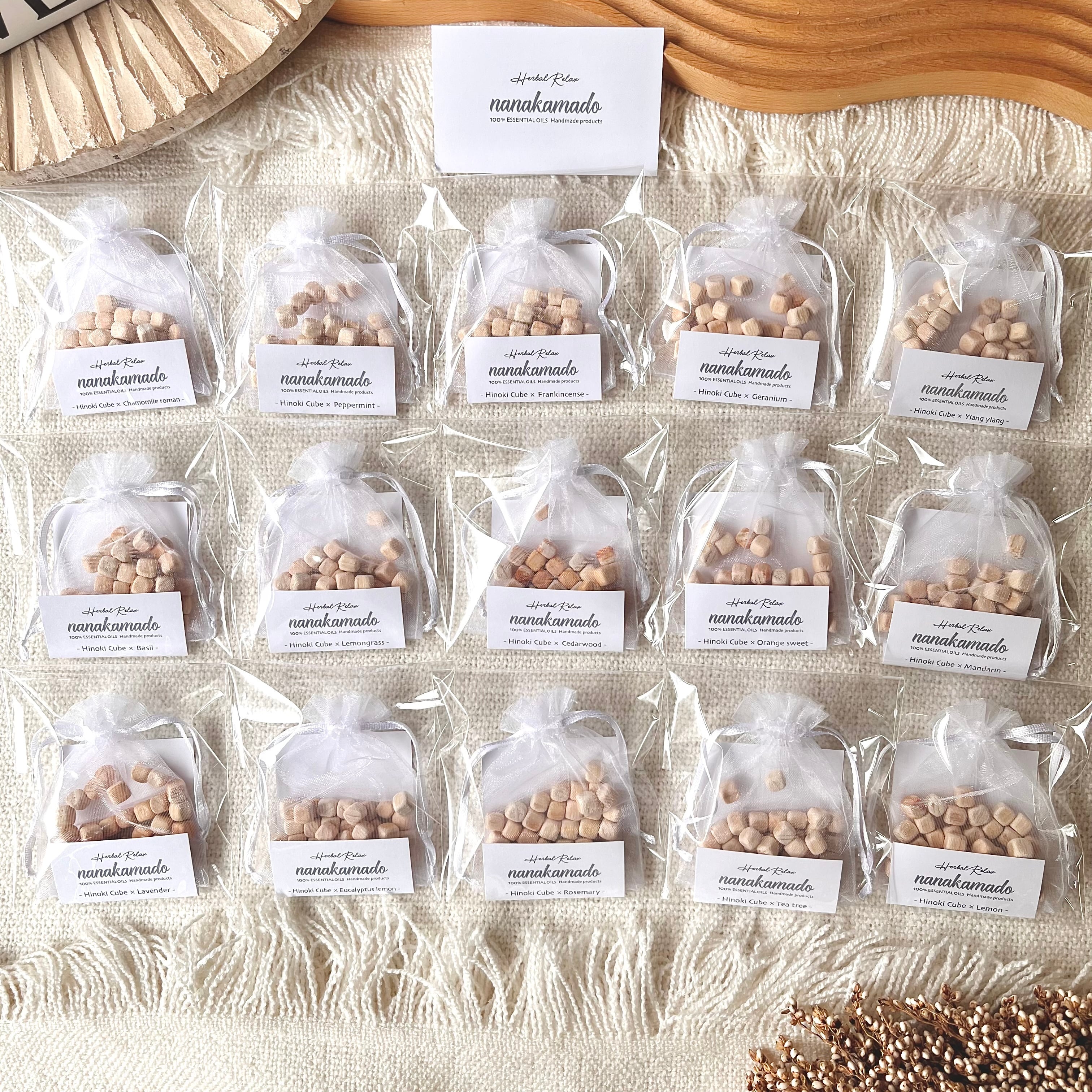 ほんのり”ひのきの香り”がするヒノキキューブに精油を染み込ませたおしゃれでサステナブルなフレグランスアイテム《nanakamadoヒノキアロマサシェ》です。